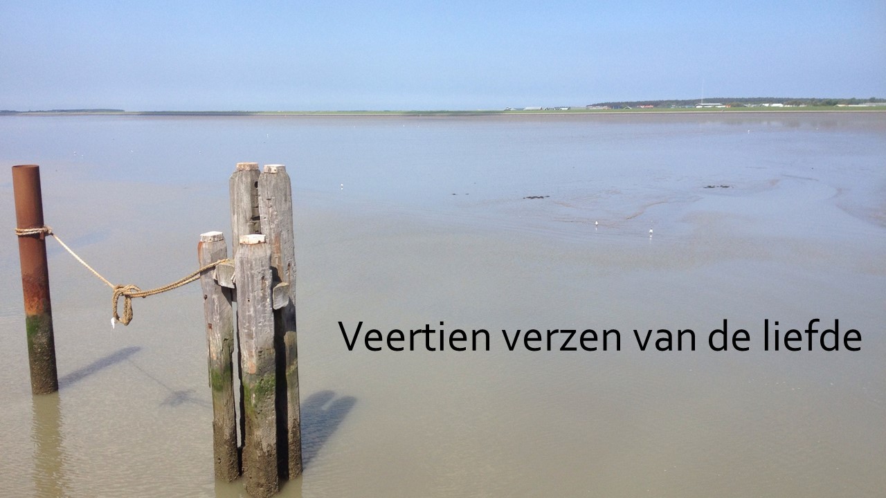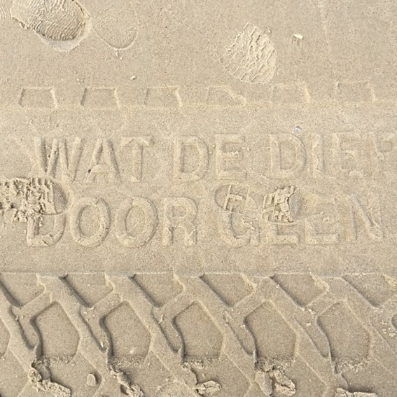 Kijk, zandsporen langs de vloedlijn, prijsgegeven om woorden een plek te geven, je moet ze wel doorvertelllen voordat ze morgen zijn uitgewist.